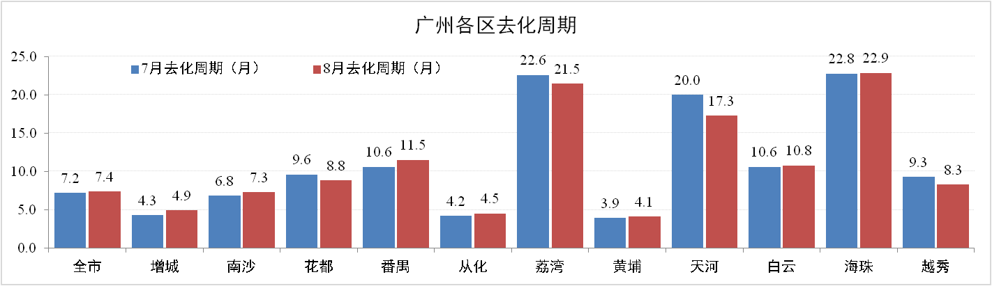 8月份廣州住宅地產(chǎn)去化率達(dá)86.6%,去化周期環(huán)比增加0.2個(gè)月為7.4個(gè)月。其中,增城、南海、番禺三區(qū)去化周期有所上升。但由于外圍地區(qū)剛需強(qiáng)勁,增城、從化、黃埔等保持低去化周期,增城去化周期僅為4.3個(gè)月。