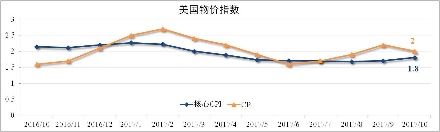 10月美國(guó)CPI為2%,較上月下滑0.2個(gè)百分點(diǎn),復(fù)合市場(chǎng)預(yù)期,主要原因是颶風(fēng)影響的能源供給恢復(fù)從而導(dǎo)致能源價(jià)格下跌。剔除能源項(xiàng)的核心CPI終結(jié)了連續(xù)4個(gè)月的持平,較上月擴(kuò)大0.1個(gè)百分點(diǎn)報(bào)1.8%,超出市場(chǎng)預(yù)期。
