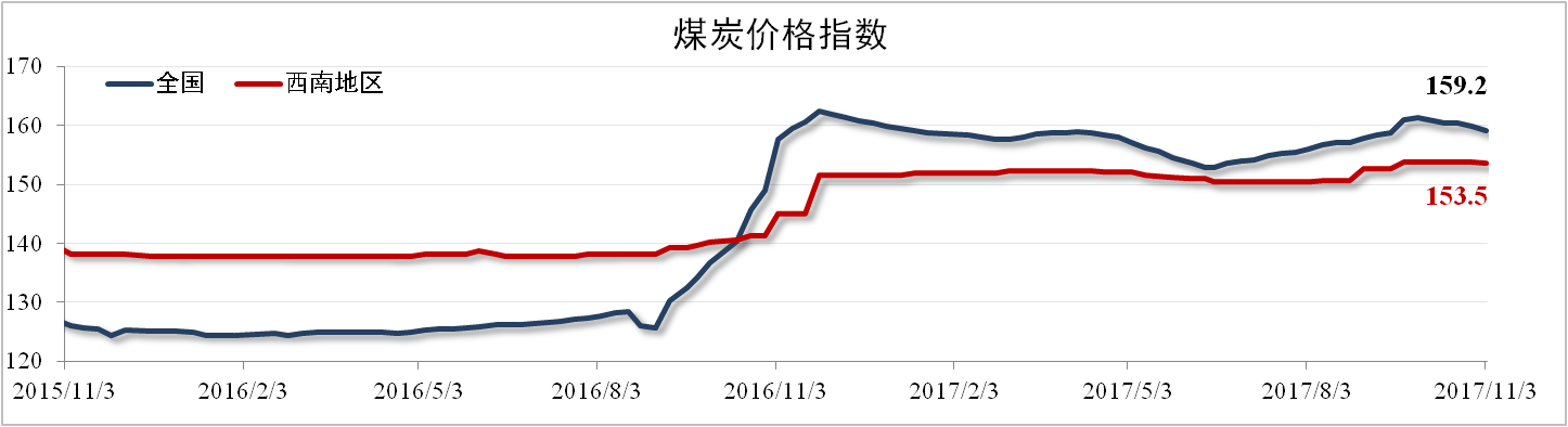 日前國(guó)家發(fā)改委召開(kāi)新聞發(fā)布會(huì),表示將力控冬季供暖期間煤炭?jī)r(jià)格。截至11月3日,中國(guó)煤炭?jī)r(jià)格指數(shù)報(bào)159.2點(diǎn),環(huán)比下降0.5%,西南地區(qū)煤炭?jī)r(jià)格指數(shù)報(bào)153.5點(diǎn),環(huán)比下降0.07%。