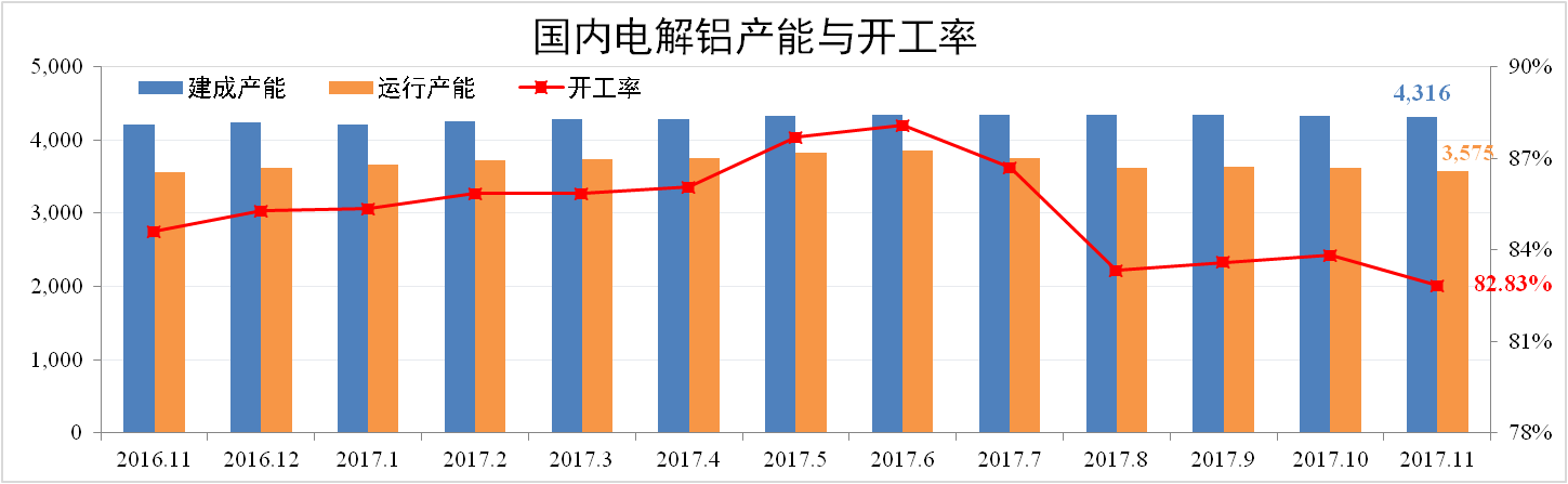 11月份中國(guó)電解鋁總產(chǎn)能4,316萬噸,運(yùn)行產(chǎn)能3,575萬噸,開工率82.83%,其中運(yùn)行產(chǎn)能環(huán)比下降1.4%。據(jù)百川資訊統(tǒng)計(jì),截至12月7日,2017年中國(guó)電解鋁累計(jì)已減產(chǎn)494.8萬噸,已確定待減產(chǎn)19.7萬噸,年內(nèi)累計(jì)已復(fù)產(chǎn)143.8萬噸。