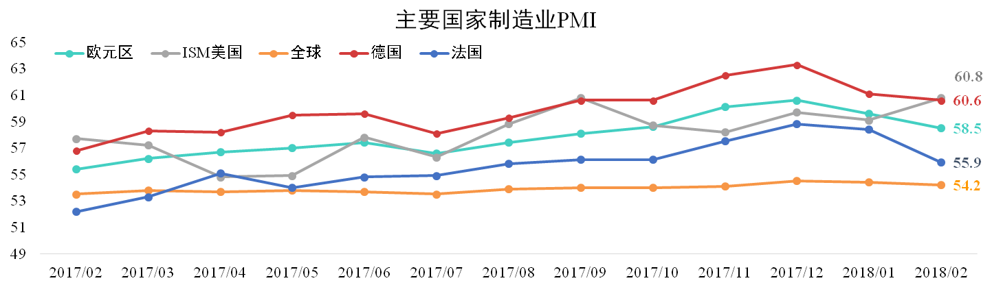 全球經(jīng)濟(jì)景氣程度有所放緩,且發(fā)達(dá)國家之間出現(xiàn)分化。2月份全球制造業(yè)PMI為54.2,較上月下滑0.2點(diǎn)。歐洲國家PMI普遍下滑,但仍處于擴(kuò)張區(qū)間,美國ISM制造業(yè)PMI為60.8,較上月大幅擴(kuò)大2.4點(diǎn)。