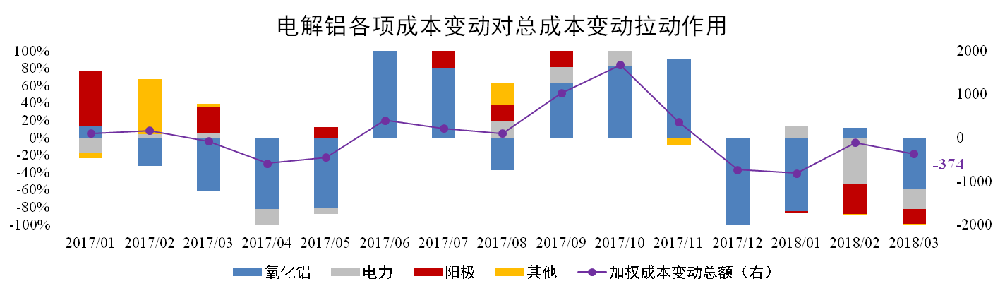 分析認為:3月氧化鋁價格受基本面及政策主導價格下降,煤炭供應寬松,煤企主動下調價格致使電力成本繼續(xù)下跌,陽極復產加快供應過剩拖累價格進一步下滑,預計電解鋁成本仍將延續(xù)下降趨勢。