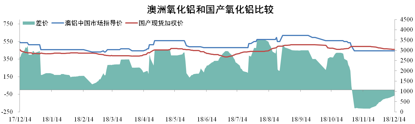 截至12月14日,國產(chǎn)氧化鋁現(xiàn)貨加權(quán)均價(jià)為3040元/噸,環(huán)比下降0.23%。澳鋁中國市場指導(dǎo)價(jià)為2975元/噸,同比下降11.85%,國產(chǎn)氧化鋁價(jià)格較澳鋁指導(dǎo)價(jià)高出65元/噸。