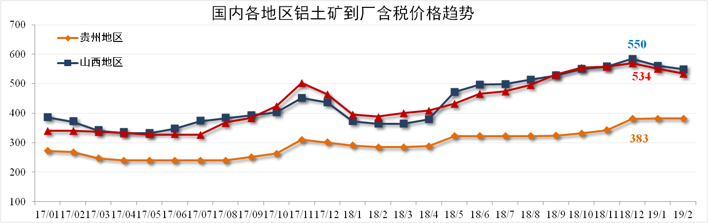 2月份,各地鋁土礦價格有不同程度的下滑,貴州(AL:60%,A/S:5.5-6)到廠含稅價月均價383元/噸,與1月價格持平;山西鋁土礦550元/噸,環(huán)比下降2.03%;河南鋁土礦534元/噸,環(huán)比下降3.09%。