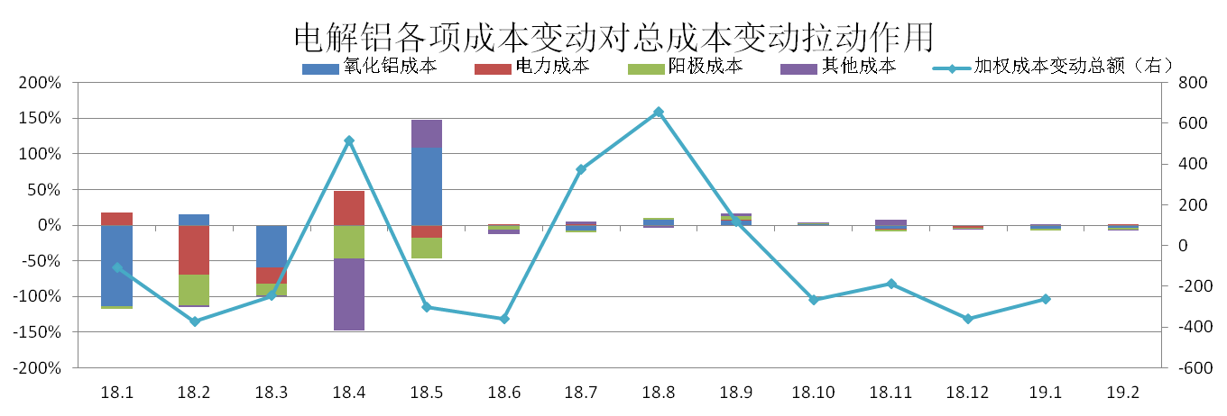 分析認(rèn)為:2月氧化鋁成本、陽(yáng)極成本均有所回落,但電力成本稍有上漲,整體電解鋁價(jià)格的成本有小幅的下跌。2月氧化鋁價(jià)格繼續(xù)下跌,片堿價(jià)格受其影響位于低位,預(yù)計(jì)電解鋁成本降幅增大。