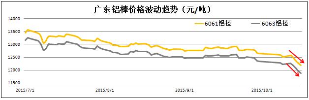 受全球鋁市疲態(tài)的影響,報(bào)告期內(nèi)我國(guó)鋁棒價(jià)格呈現(xiàn)出階段性大跌的異?,F(xiàn)象。截至10月中旬,廣東6063型鋁棒價(jià)格下浮至10995元/噸,月化環(huán)比下降11.1%。鋁棒價(jià)格大幅下浮的另外一個(gè)主要原因是鋁型材市場(chǎng)需求在原本疲憊的環(huán)境下,原料需求進(jìn)入季節(jié)性淡季。