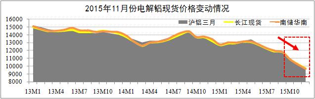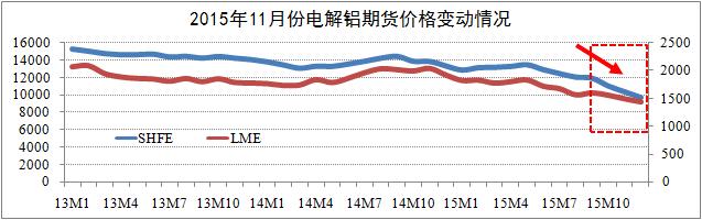 期貨市場(chǎng)方面:截至11月24日,滬鋁三月結(jié)算跌至9670元,自跌破萬(wàn)元大關(guān)以來(lái),滬鋁主力合約日均漲跌幅為1.4%-2.1%;LME鋁三月結(jié)算跌至1446美元,其跌幅自今年8月以來(lái)開始低于滬鋁跌幅。研究認(rèn)為,滬鋁三月與LME鋁三月結(jié)算價(jià)將逐步筑底于9600元關(guān)口(Min.值),期鋁價(jià)格將迎來(lái)較大的反彈空間。