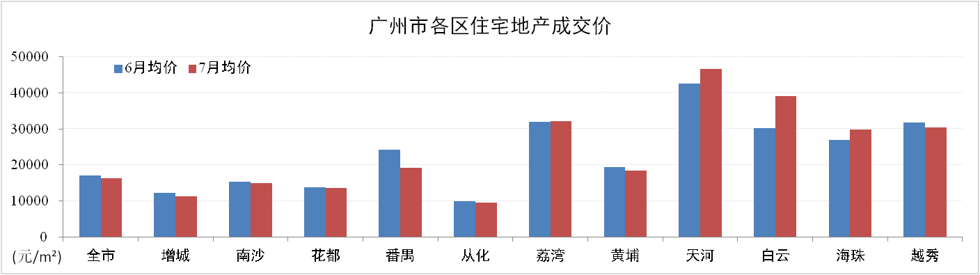 成交價(jià)方面:7月份廣州一手住宅成交均價(jià)為16,289元/m2,環(huán)比下跌1.65%。其中,增城成交均價(jià)為11,302元/m2,環(huán)比下跌7.67%。天河區(qū)、白云區(qū)、海珠區(qū)成交均價(jià)有所上升,其中白云上升29.69%。