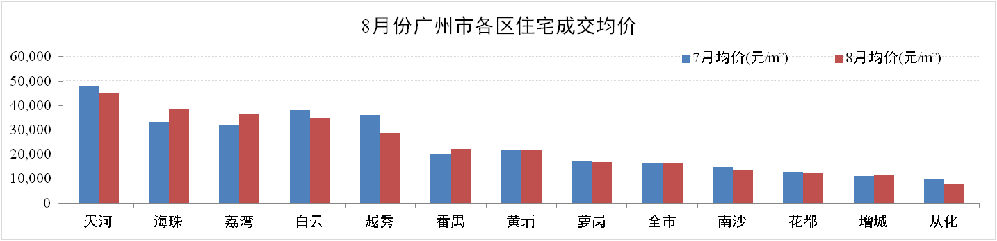 成交價(jià)方面:8月份廣州一手住宅成交均價(jià)16,313元/m2,環(huán)比下跌1.99%。其中,增城成交均價(jià)為11,617元/m2,環(huán)比上升3.03%。除海珠、荔灣、番禺及增城保持增長(zhǎng)外,其他區(qū)域成交均價(jià)均錄得不同程度下跌,其中越秀跌幅達(dá)20.63%。