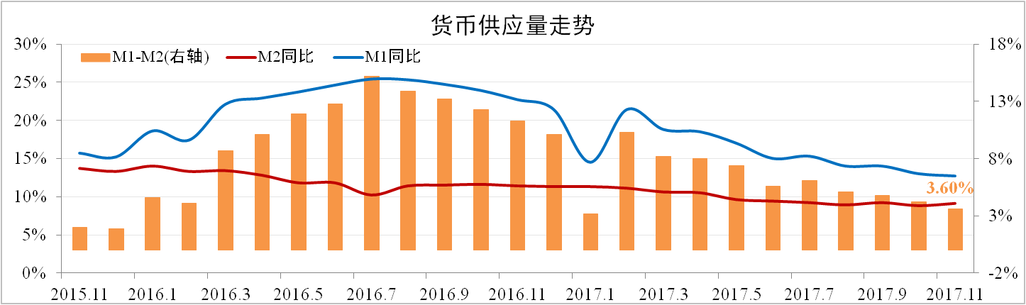 分析認為:貸款增加與財政存款支出增加是M2增長的主要原因。一方面銀行減少非標投資轉向企業(yè)貸款,另一方面雙十一刺激居民短期消費貸增加。考慮到季末效應以及信貸投放額度,預計12月M2增速有小幅放緩。