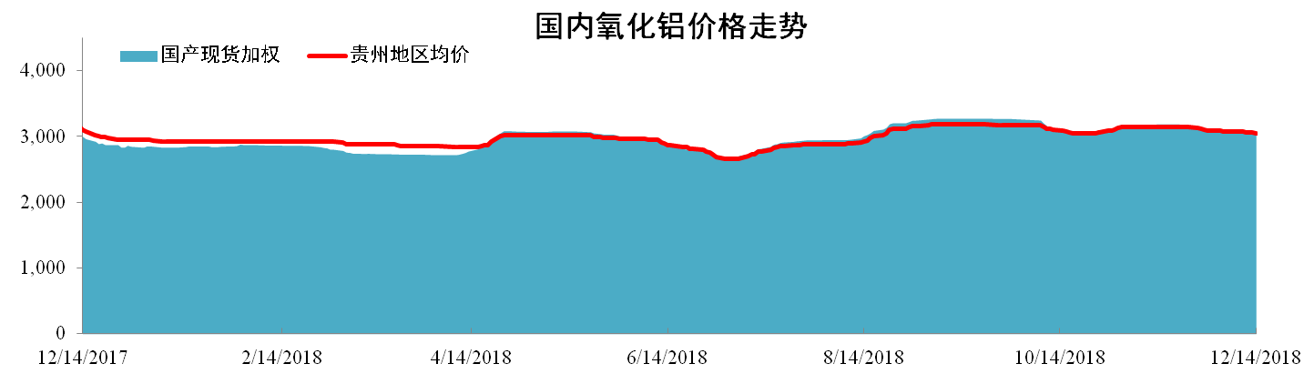 截至12月14日,國產(chǎn)氧化鋁現(xiàn)貨加權(quán)均價(jià)為3040元/噸,同比上漲1.33%,環(huán)比下降0.23%。貴州地區(qū)氧化鋁現(xiàn)貨加權(quán)均價(jià)為3050元/噸,同比下降1.61%,環(huán)比下降0.23%。